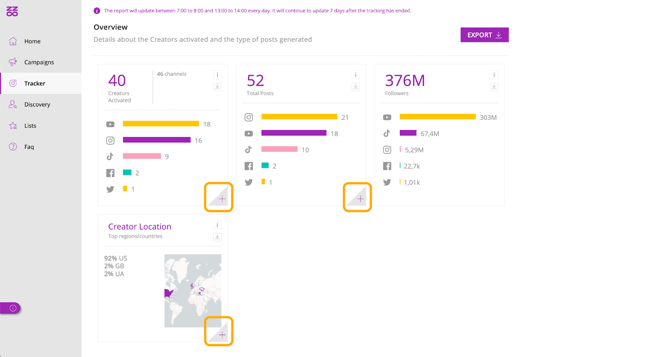 Overview, the area dedicated to details about the tracked creators and contents. By clicking on the [+] at the bottom right in the Activated Creators box and in the Total Posts box, you can access the details of the creators involved in the campaign, along with the results obtained, and the details of the posts they have created, highlighting the metrics for each profile. By clicking on the [+] in the Creator Origin box, you can instead view the data related to the geolocation of the creators participating in the campaign.
